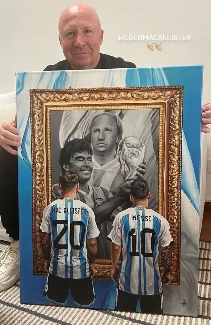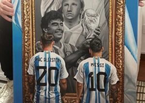Per l’occasione, il 24enne centrocampista del Liverpool ha regalato al papà un murale in cui lui e Lionel Messi – che hanno fatto parte della squadra campione del mondo in Qatar – guardano una foto in cui Carlos Mac Allister e Diego Armando Maradona, che ha indossato anche con lui la maglietta dell’Albiceleste, posano.