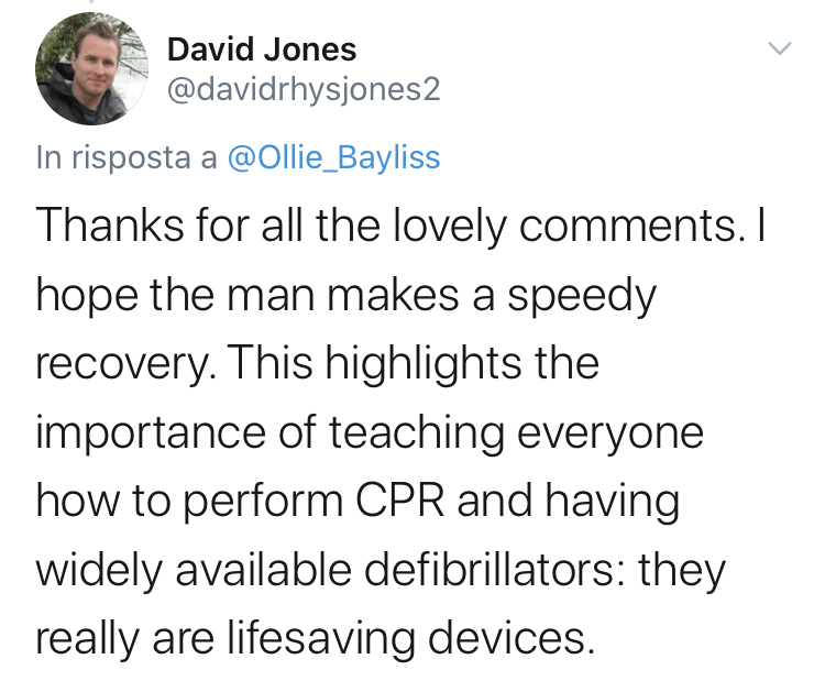 Il signor Jones, poi, ha twittato sottolineando l’importanza dei defibrillatori perché “sono davvero dispositivi salvavita”. Una giornata che poteva diventare drammatica, ma che, grazie a Dio e a David, si è chiusa in modo positivo.