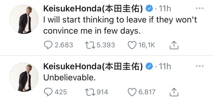 “Incredibile”, il primo tweet; “Inizierò a pensare di andarmene se non mi convinceranno in pochi giorni”, il secondo cinguettio a stretto giro dell’ex Milan, che ha preoccupato ancora di più i fan.