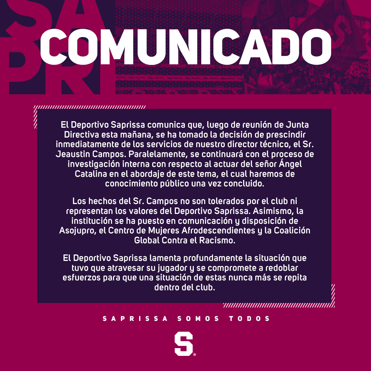 Per questo motivo nella mattinata di martedì 28 marzo ha rilasciato un comunicato annunciando l’esonero del tecnico, in quanto “le azioni di mister Campos non sono tollerate dalla società né rappresentano i valori del Deportivo Saprissa”.