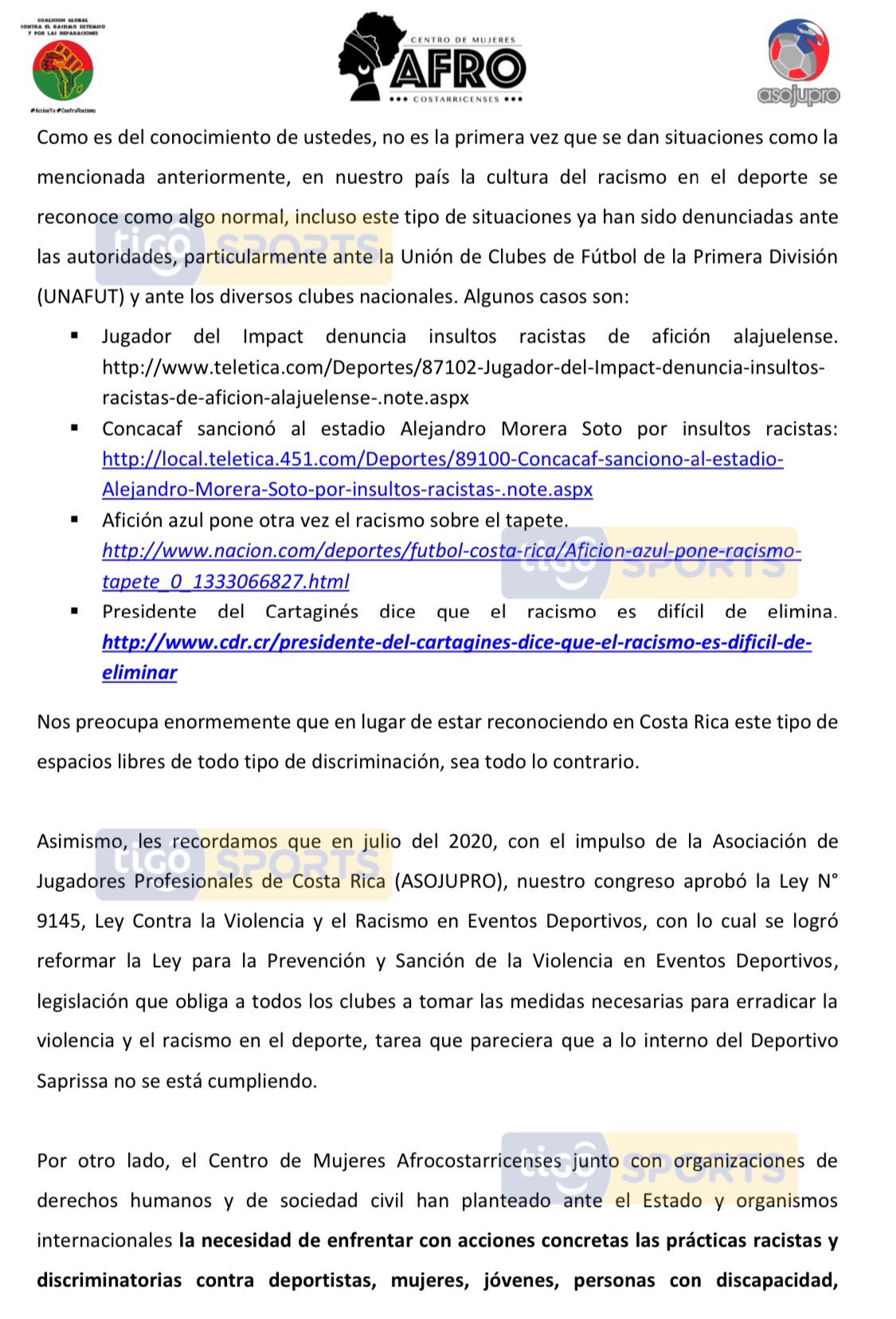 “Il Deportivo Saprissa è profondamente dispiaciuto per la situazione che il suo giocatore ha dovuto affrontare e si impegna a raddoppiare i propri sforzi affinché una situazione del genere non si ripeta mai all’interno del club”, si legge nella nota.
