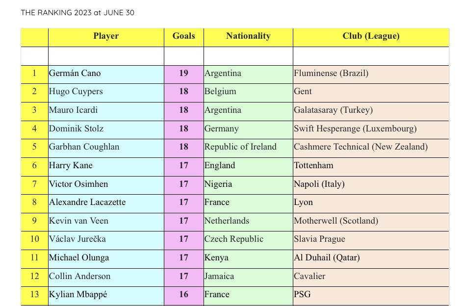 Da inizio gennaio a fine giugno, infatti, l’attaccante argentino del Galatasaray è terzo nella classifica mondiale assoluta dei marcatori dietro al leader German Cano, 35enne connazionale che gioca nel Fluminense, e a Hugo Cuypers, 26enne punta del Gent.