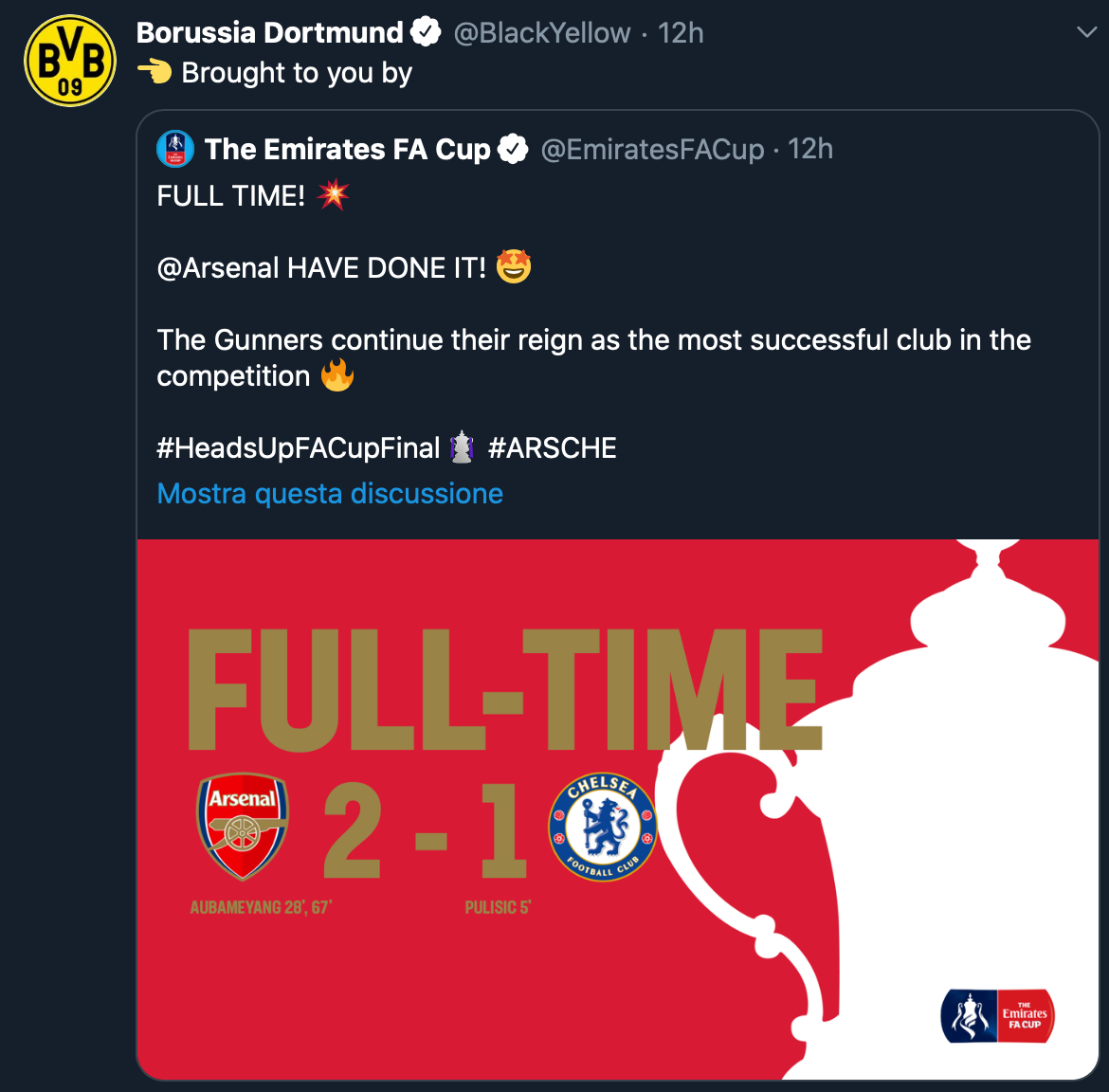 Ma a prendersi i meriti per la super finale vinta dai Gunners è stato il… Borussia Dortmund. Sì, perché l’account Twitter inglese del club tedesco ha condiviso il post del profilo della FA Cup scrivendo “Brought to you by”, ovvero “portato a voi da”.