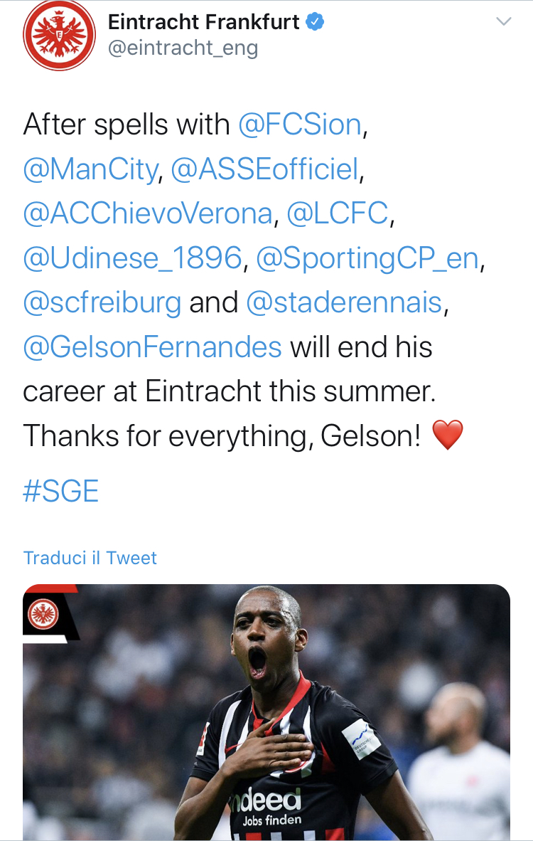 Un tweet per comunicare di aver appeso gli scarpini al chiodo. Così la scorsa settimana Gelson Fernandes, 33enne centrocampista dell’Eintracht Francoforte, aveva annunciato il ritiro dal calcio giocato al termine della Bundesliga.
