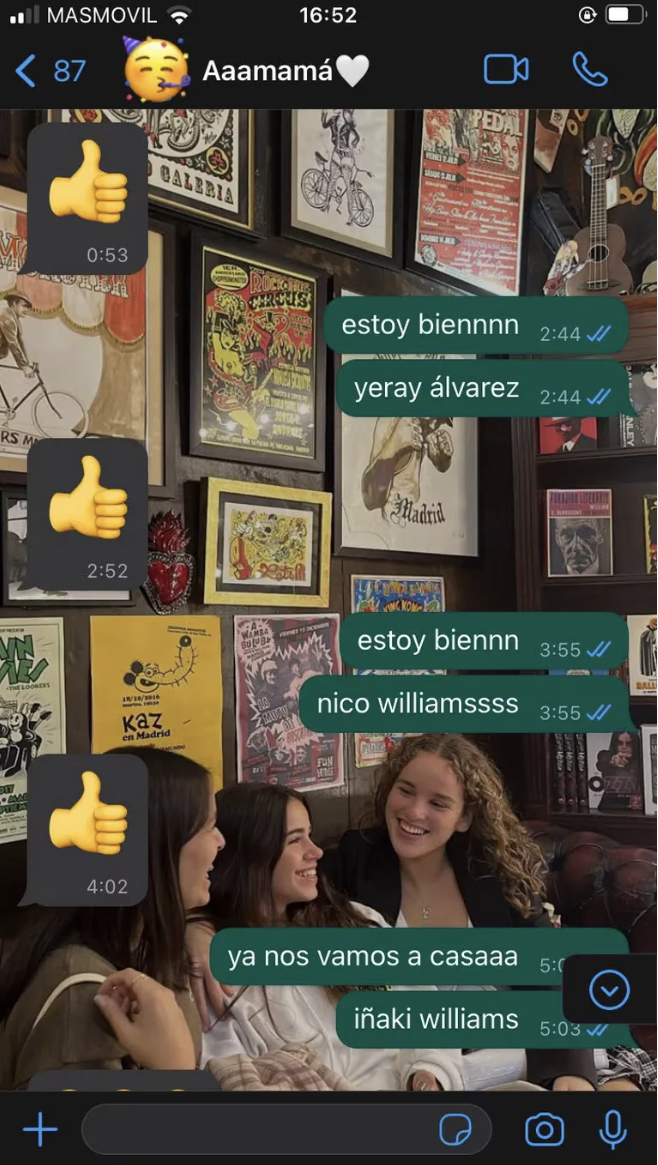 L'immagine mostra che alle 2.44 la giovane donna scrive: “Sto bene. Yeray Álvarez”. Un’ora più tardi, la ragazza scrive di nuovo: “Sto bene. Nico Williams”. Infine, alle 5 del mattino scrive: “Sto bene. Iñaki Williams”. La madre, attenta, risponde con un pollice in su a ciascuno dei messaggi.