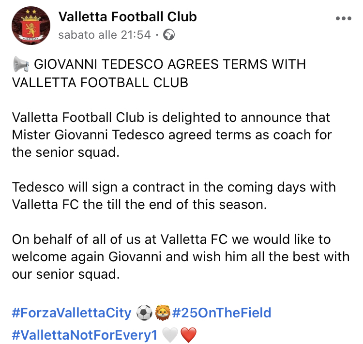 “La squadra – ha chiarito ancora Tedesco – gode di un grande seguito da parte di fan appassionati; ciò moltiplica le enormi pressioni di questo lavoro. L’organizzazione pressoché perfetta del club, poi, aumenta la mia motivazione a provare a dare il meglio che posso per la società. Sicuramente, ho un grande desiderio di aiutare il Valletta a tornare al vertice, in particolare dopo quanto successo con il titolo del campionato assegnato sulla base di decisioni prese al di fuori del campo di calcio (scudetto assegnato al Floriana di Riccardo Gaucci, team allenato due volte dallo stesso Tedesco qualche anno fa, con tre punti di vantaggio sul Valletta, nda). Mi aspetto che gli eventi di quest’anno doteranno tutti i giocatori di una motivazione in più e una determinazione ancora più grande per affrontare ogni partita e avere successo”.