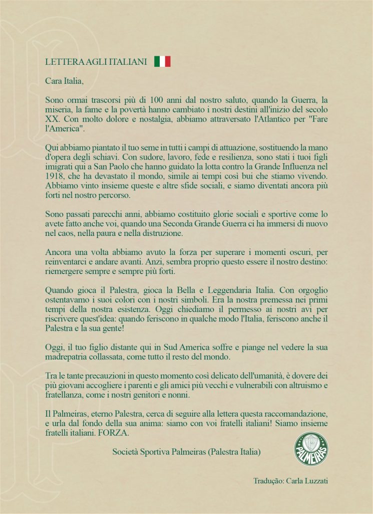 “Quando gioca il Palestra, gioca la Bella e Leggendaria Italia. Con orgoglio ostentavamo i suoi colori con i nostri simboli. Quando feriscono in qualche modo l’Italia, feriscono anche il Palestra e la sua gente. Oggi il tuo figlio distante qui in Sudamerica soffre e piange nel vedere la sua madrepatria collassata, come tutto il resto del mondo”. Messaggio commosso quello del Palmeiras, gloriosa squadra di San Paolo nata da immigrati italiani nel 1914 come "Palestra Italia" (cambiò nome nel settembre 1942) e da sempre legata al calcio nostrano. Il Verdão solidarizza con il Bel Paese in una lunga lettera.