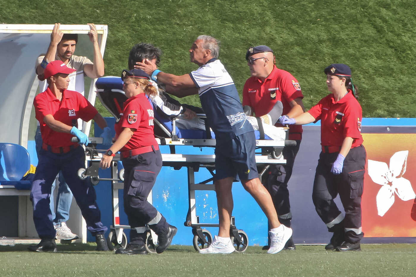 I giocatori sono caduti sulla gamba dell’allenatore Fernando Jorge Tavares de Oliveira, conosciuto come Bock, lasciandolo a terra. I medici sono intervenuti dopo lo scontro per verificare le condizioni di entrambi i calciatori e del mister, che accusava forti dolori.
