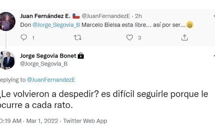 Il 66enne tecnico è stato licenziato domenica scorsa dal Leeds e Jorge Segovia, ex dirigente dell’Asociación Nacional de Fútbol Profesional cilena, ha pubblicato un ironico tweet nei confronti dell’argentino