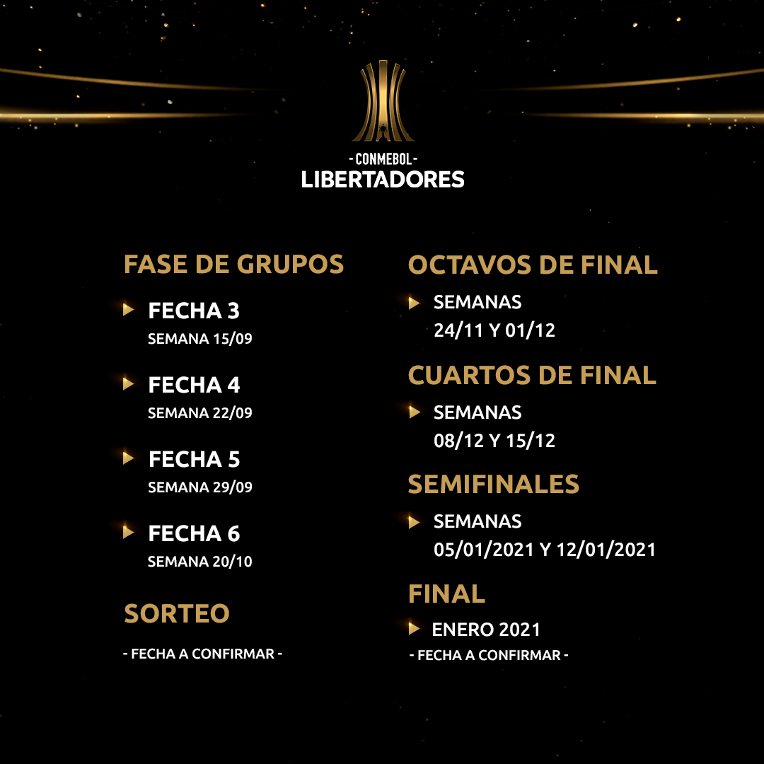 La Copa Libertadores riprenderà il 15 settembre. Lo ha stabilito la CONMEBOL, che ha aggiunto come alla ripresa in autunno si ripartirà esattamente da dove ci si era fermati, con la disputa delle ultime sfide della fase a gironi e poi si andrà avanti con la fase a eliminazione diretta.