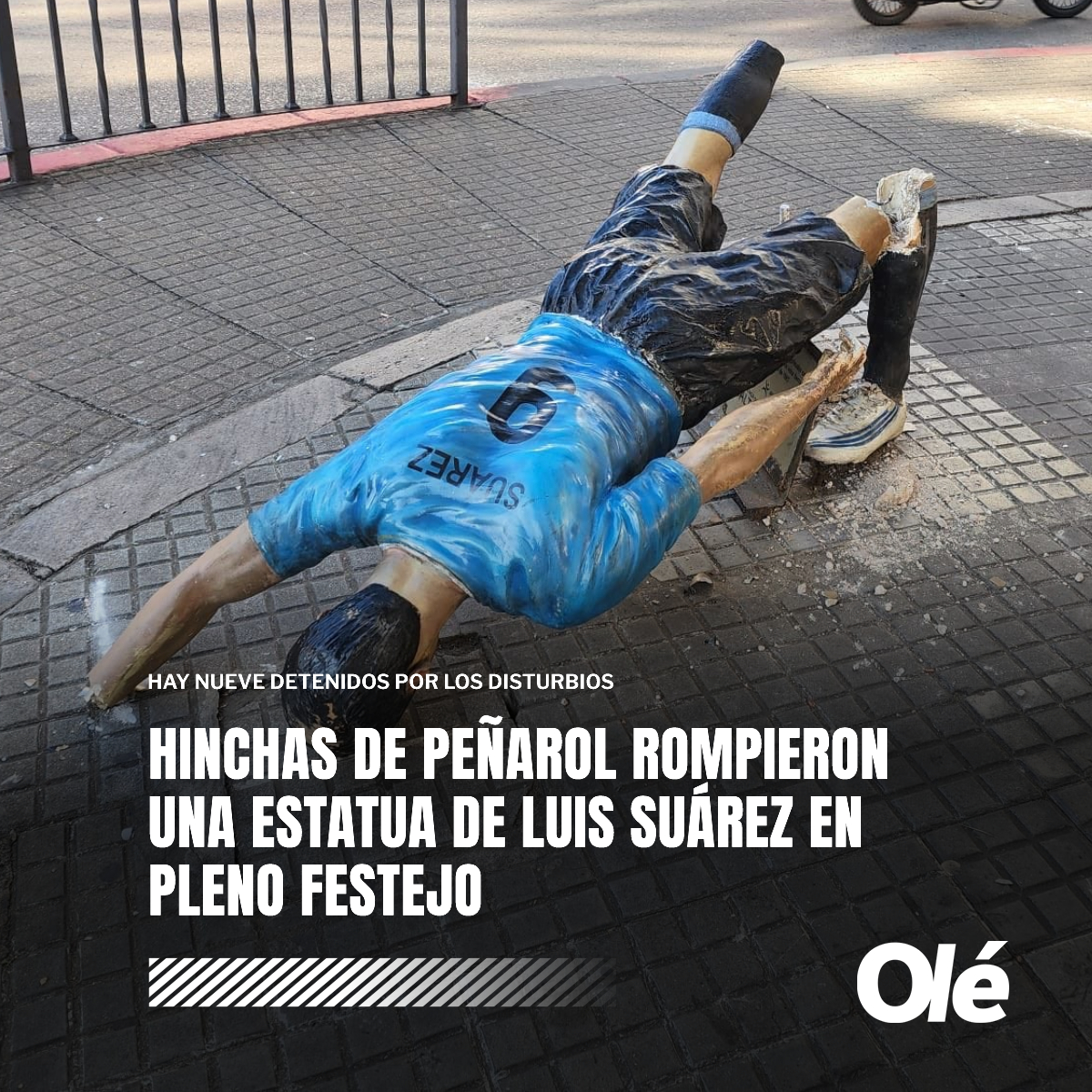Tiraron abajo la estatua de Luis Suárez durante los festejos de Peñarol en Salto. Varias personas fueron detenidas por pedreas a móviles policiales. pic.twitter.com/SK0ImLih0z