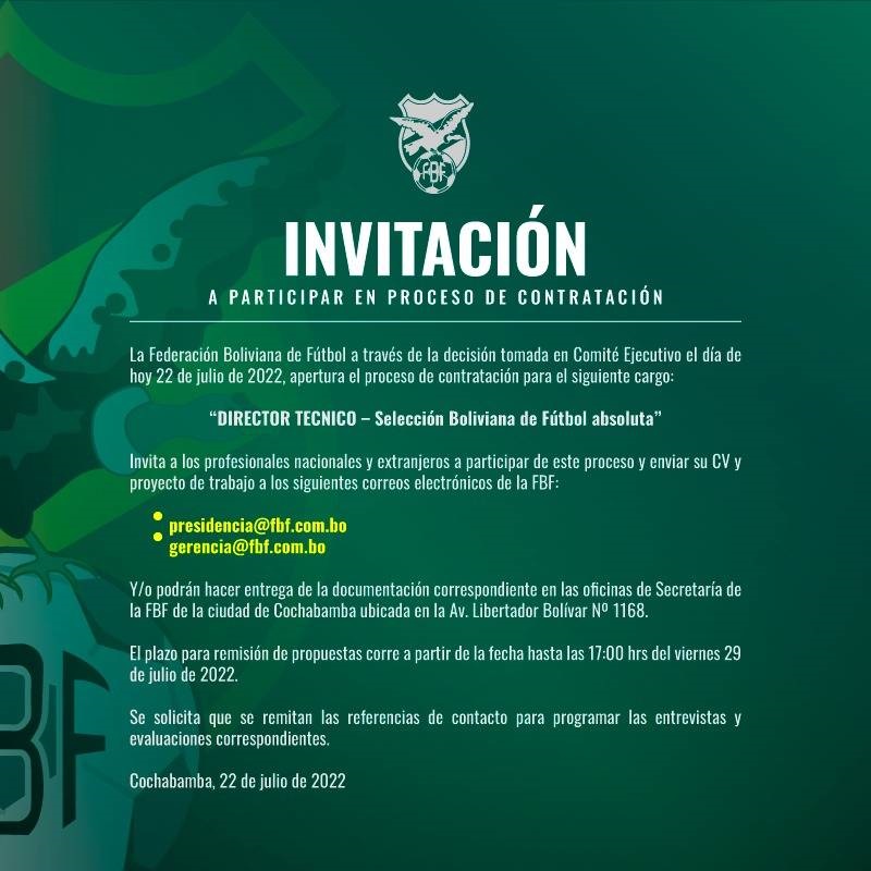 “La FBF comunica l’apertura della procedura di assunzione per il seguente incarico: Direttore tecnico – Nazionale di calcio boliviana”, si legge nel post. Nel volantino si invitano gli interessati a “inviare il proprio CV alle email presidencia@fbf.com.bo o gestion@fbf.com.bo o a mano, presso gli uffici della Segreteria FBF nella città di Cochabamba”.