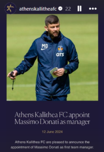Massimo Donati riparte dall'Athens Kallithea. L'ex centrocampista di Milan, Atalanta e Celtic Glasgow (tra le altre) ha firmato un contratto di un anno con opzione per la stagione successiva fino al 30 giugno 2026. Il club, con sede nel comune alla periferia dell'Attica (unità periferica di Atene Meridionale), ha vissuto una stagione esaltante quest'anno con la promozione nella massima serie greca dopo 18 anni di attesa. Il club, presieduto dall'ex CEO del Venezia, Ted Philipakos, vuole programmare per bene la prossima stagione e ha deciso di affidare la panchina ad un tecnico giovane ma con già un discreto bagaglio di esperienza.Caricamento post Instagram...