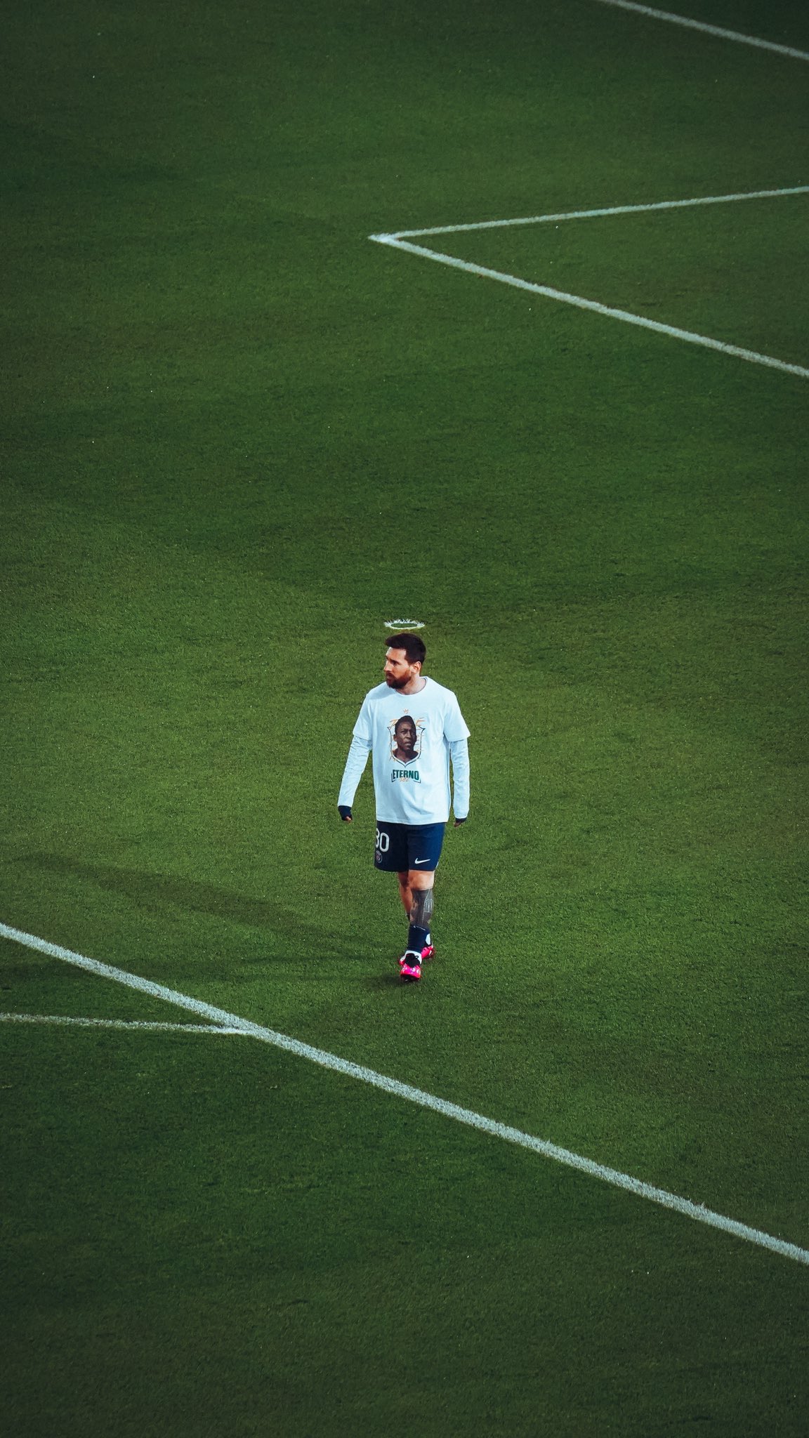 Il fotografo argentino sui suoi social ha postato una foto davvero particolare dove il fenomeno del PSG durante l'allenamento pre partita contro l'Angers, valida per la 18a giornata di Ligue 1, cammina in area di rigore indossando la maglia con una stampa del volto di Pelé e la scritta "Eternal King", ma a rendere unica questa immagine è la posizione del dischetto del rigore che casualmente (o volutamente, questo il fotografo non lo specifica) compare sulla testa dell'ex Barcellona, come un'aureola.