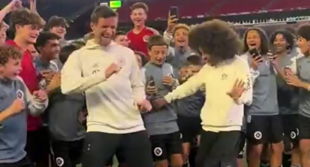 Thomas Muller palleggia: e un attimo dopo si mette a ballare con i ragazzi...