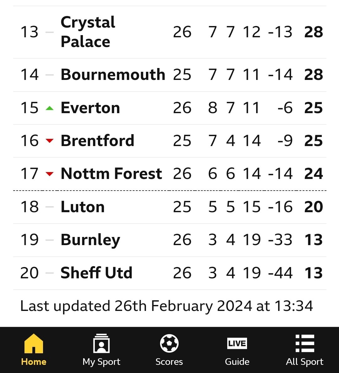 🇬🇧 Everton’s points deduction has been officially reduced from 10 to 6 following the appeal. Everton now has 25 points, 5 clear of relegation