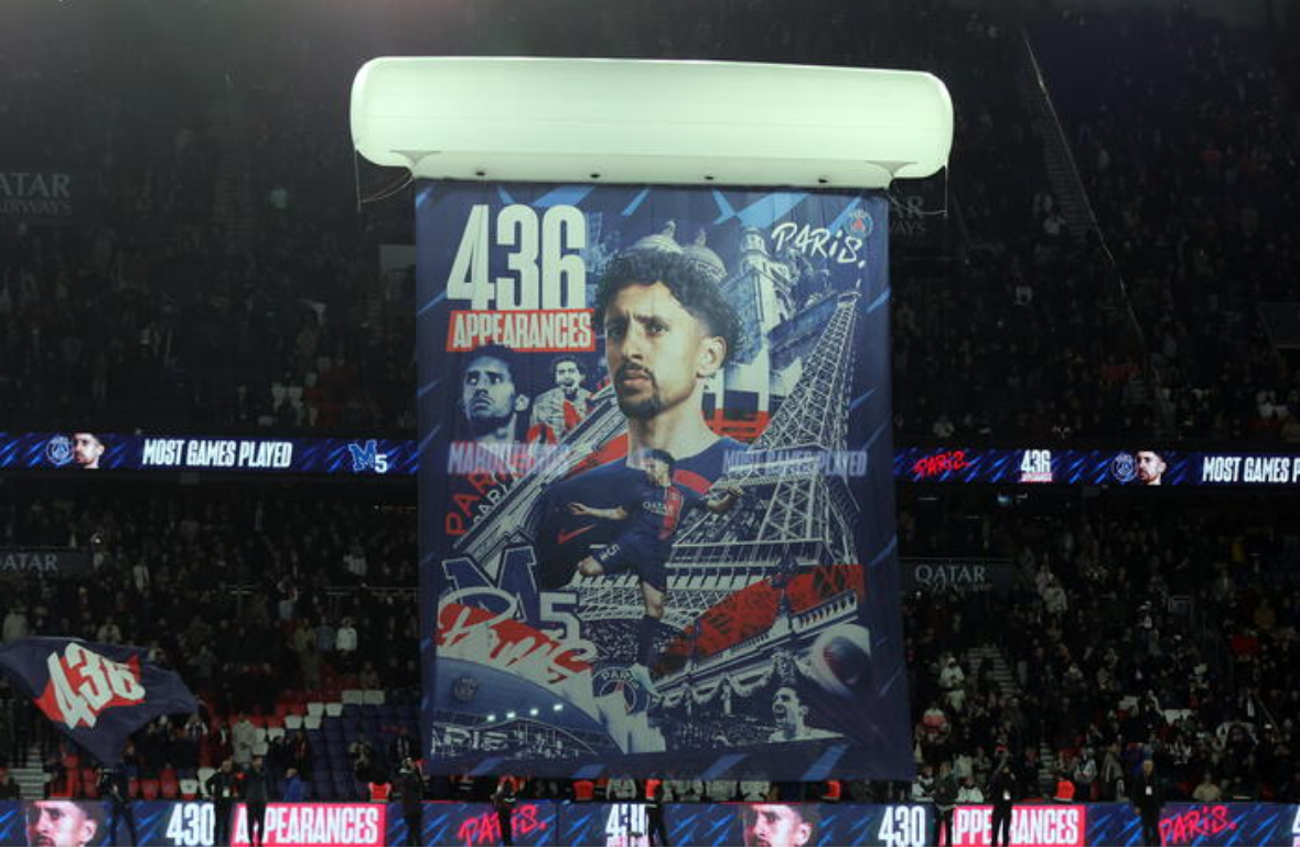 Après le succès 🆚 Lyon (4-1), le Parc des Princes a honoré son capitaine @marquinhos_m5, auteur de son 4️⃣3️⃣8️⃣ème match avec le maillot du Paris Saint-Germain. ❤️💙#Marqui436 pic.twitter.com/3oPTEeTWbG