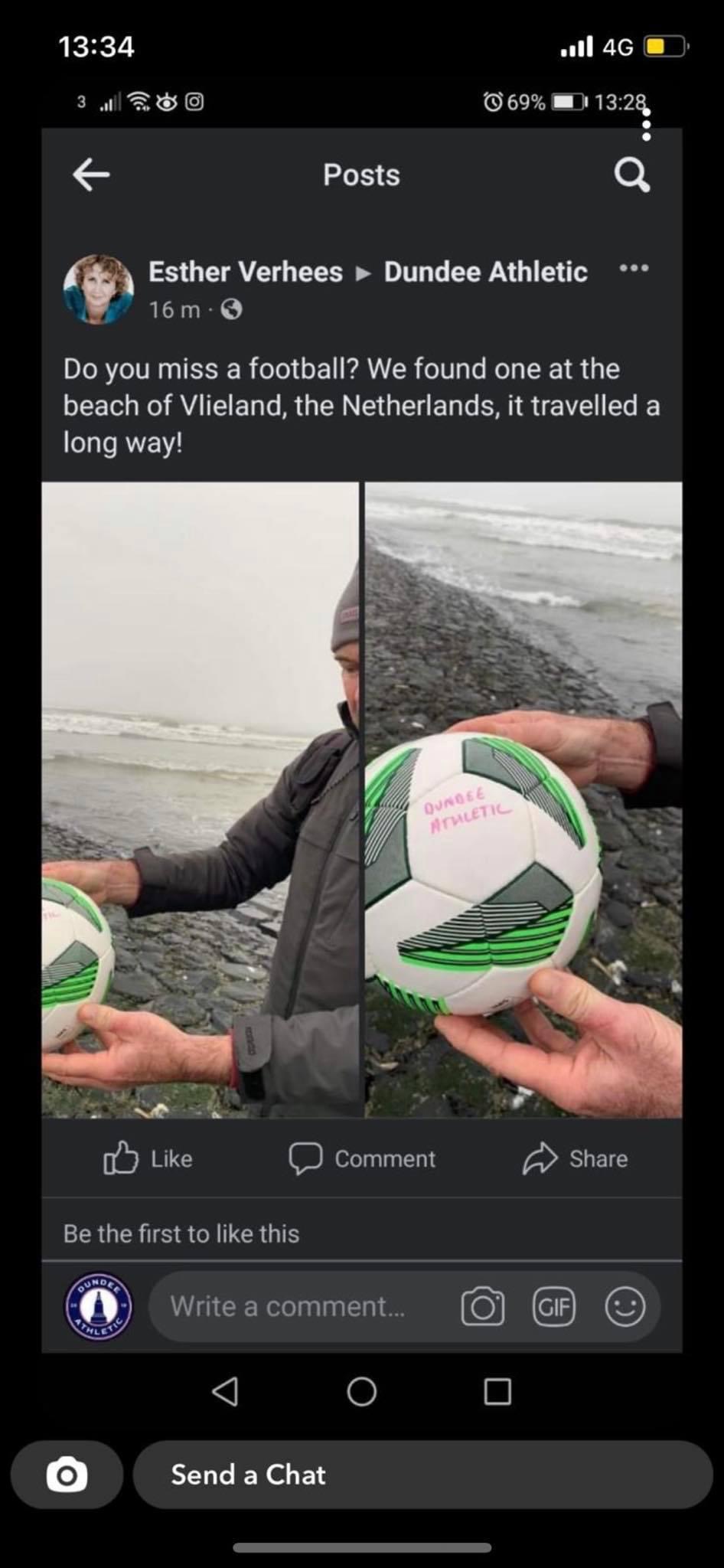 Dopo aver letto il nome della squadra scozzese sul pallone, ha deciso di postare la foto sul profilo Facebook con la seguente didascalia: "Vi manca un pallone da calcio? Ne abbiamo trovato uno sulla spiaggia di Vlieland, nei Paesi Bassi, ha fatto molta strada!".