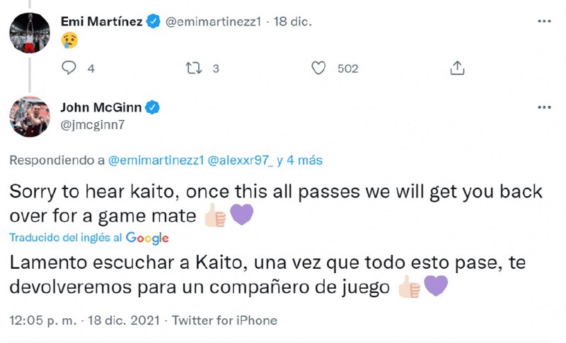 L’inaspettata situazione vissuta da Kaito Jones è arrivata alle orecchie di Emiliano Martínez. Una volta saputo della vicenda, il portiere della Nazionale argentina ha espresso la sua tristezza con una emoji su Twitter, mentre il compagno di squadra John McGinn, è andato oltre, emozionando il ragazzo per il futuro: “Mi dispiace sentire Kaito, una volta che tutto questo passerà ci vedremo di nuovo per una partita compagno”.