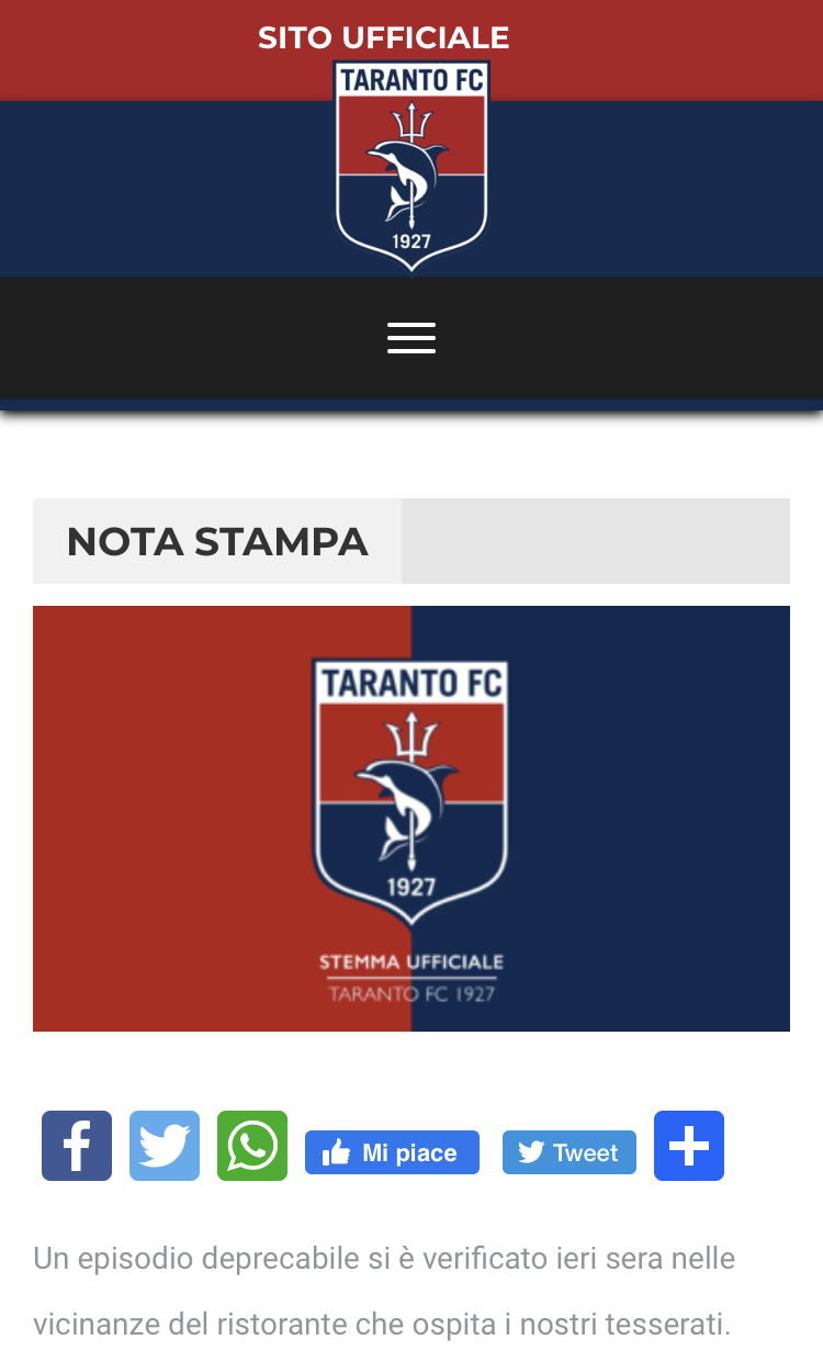 Ecco la nota ufficiale pubblicata dal club: “Un episodio deprecabile si è verificato ieri sera nelle vicinanze del ristorante che ospita i nostri tesserati. Due malintenzionati, non ancora identificati, hanno usato violenza nei confronti dei calciatori Pelliccia e Ferrara. Soltanto il buon senso dei due ragazzi ha evitato che il fatto degenerasse. La Società, nell’esprimere la più totale solidarietà ai due giocatori, peraltro esemplari nel comportamento in campo e fuori, condanna tutte le forme di violenza che, nell’ultimo periodo, stanno oltraggiando, sotto diverse forme, tutti gli addetti, tesserati e non, contribuendo a creare un clima insostenibile di guerriglia poco confacente ai principi che dovrebbero accompagnare la pratica sportiva nonché, cosa ancora più grave, deturpando l’immagine pubblica della città su scala nazionale. Il club ha altresì provveduto ad attivare tutte le azioni necessarie per assicurare i soggetti di cui sopra alla giustizia e resterà vigile affinché il calcio a Taranto non si trasformi in un veicolo di violenza con il serio rischio di degenerare in una preoccupante deriva che possa mettere a repentaglio l’integrità fisica e morale degli sportivi e di tutte le persone in genere”.