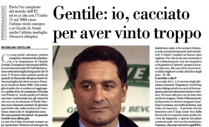 Chiaro e trasparente. L'ex bandiera della Juventus, Claudio Gentile, campione del mondo con l'Italia nel 1982 ed ex ct dell'Under 21 che ha vinto l'ultimo titolo europeo nel 2004 e la medaglia di bronzo alle Olimpiadi di Atene, nel corso di un'intervista su "Avvenire", ha toccato diversi temi, tra cui quello della sua lunga assenza in panchina (19 anni).
