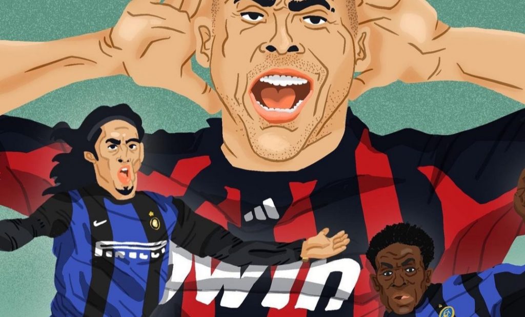 Nel suo disegno social sono entrati Ronaldo ("Lui con loro...") anche se poi quel derby l'Inter lo ha vinto 2-1, Schelotto ("Costretti a segnare con lui...) in un derby finito in parità e Kallon ("Suo l'ultimo pallone...") con la parata di Abbiati che diede al Milan la qualificazione alla finale di Champions League.
