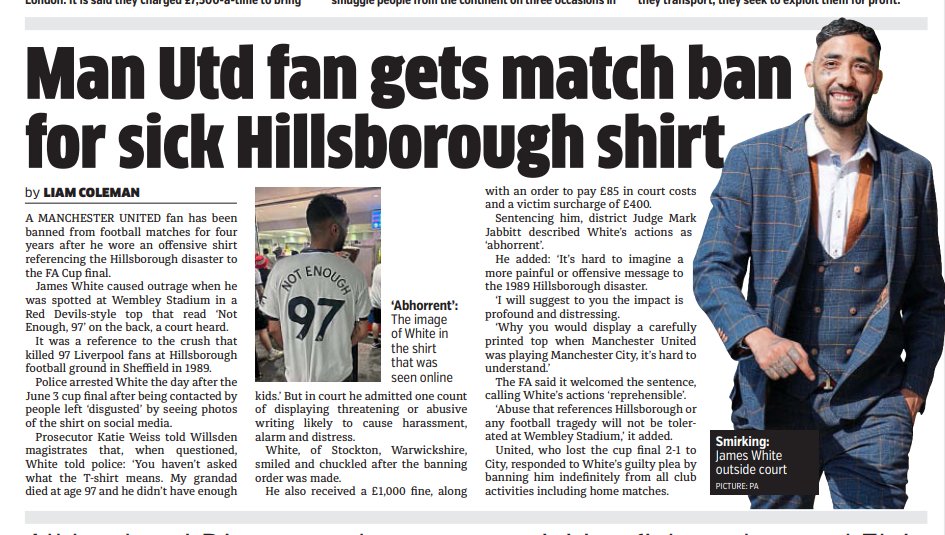 Il tifoso dei Red Devils si chiama James White ed era a Wembley il 3 giugno scorso, dove Manchester City e Manchester United stavano disputando l'ultimo atto della più antica competizione calcistica ufficiale al mondo, con addosso una t-shirt con il numero 97, in riferimento al numero delle vittime di Hillsborough, e la frase “Non è abbastanza”.