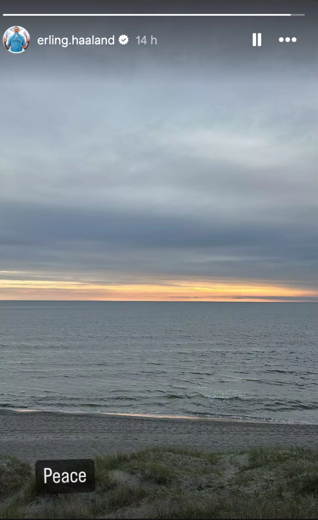 L’attaccante del City ha postato una storia Instagram con una foto di un tramonto su una spiaggia e la didascalia: "Peace".
