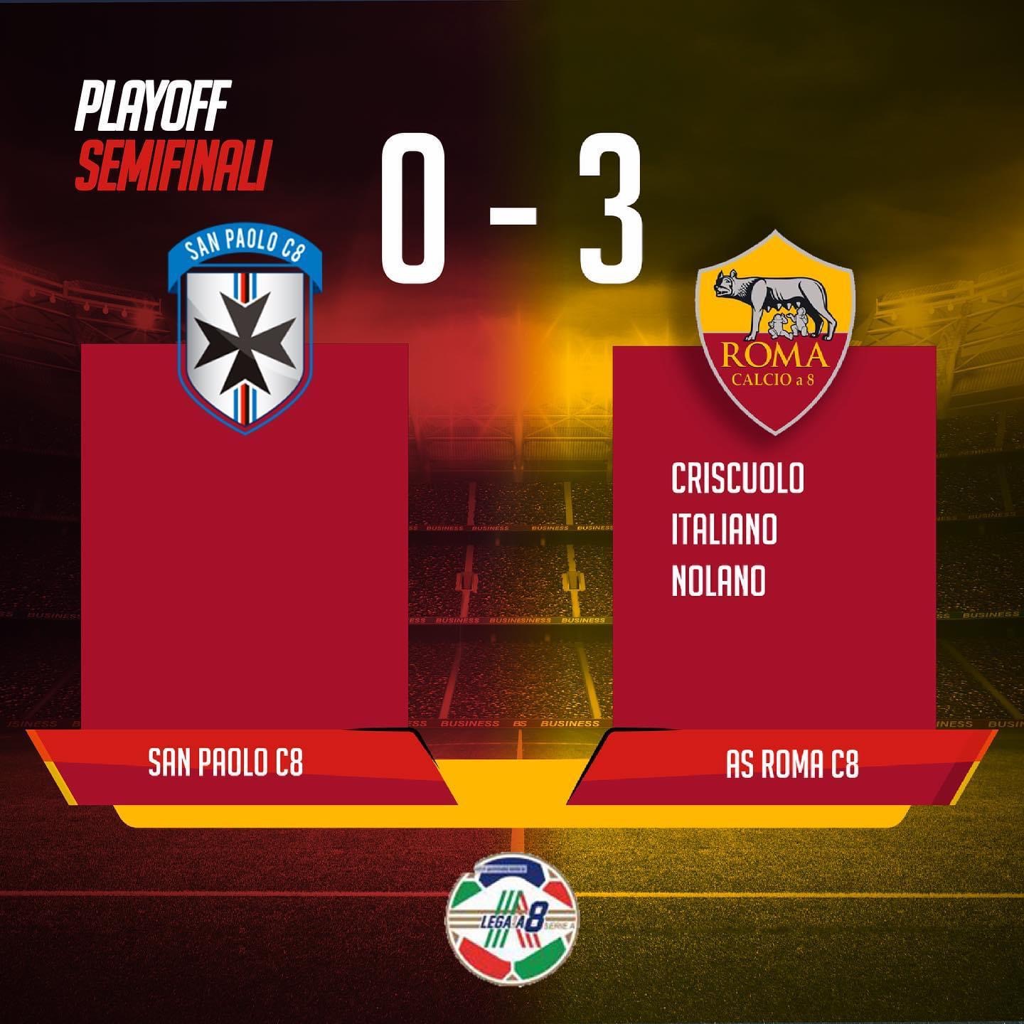 L’AS Roma Calcio a 8 è in finale scudetto. Nella cornice dello Sport City, davanti a una cinquantina di tifosi, i giallorossi battono il San Paolo con un sonoro 3-0