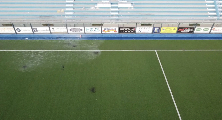 Partita infuocata al "Vito Curlo". I danni al terreno di gioco provocati dagli ultras ospiti.