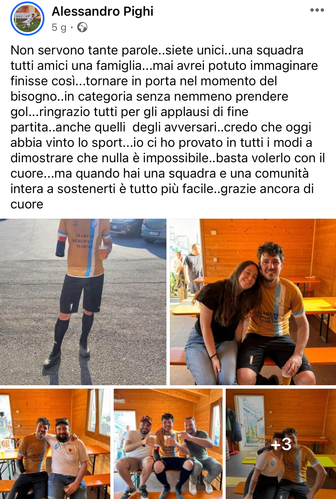 Su Facebook, dopo la gara col Vetta, ha scritto: "Non servono tante parole..siete unici..una squadra tutti amici una famiglia…mai avrei potuto immaginare finisse così…tornare in porta nel momento del bisogno..in categoria senza nemmeno prendere gol…ringrazio tutti per gli applausi di fine partita..anche quelli degli avversari..credo che oggi abbia vinto lo sport…io ci ho provato in tutti i modi a dimostrare che nulla è impossibile..basta volerlo con il cuore…ma quando hai una squadra e una comunità intera a sostenerti è tutto più facile..grazie ancora di cuore".