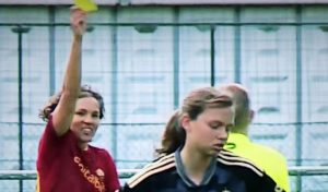 Divertente scena al termine del match tra la calciatrice ed il direttore di gara