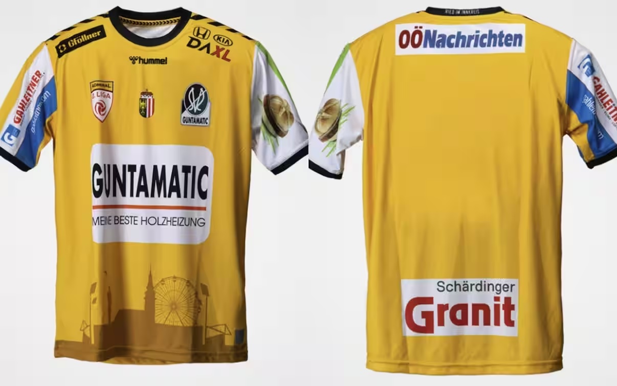 La maglietta da trasferta dell'SV Ried è gialla con loghi neri e nella parte inferiore si trova lo skyline di Ried, comune di 11.680 abitanti nel distretto di Ried im Innkreis.