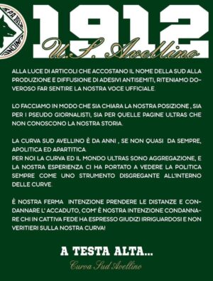 La Curva Sud Avellino è da anni se non quasi da sempre, apolitica ed apartitica. Per noi la curva ed il mondo ultras sono aggregazione, e la nostra esperienza ci ha portato a vedere la politica sempre come uno strumento disgregante all’interno delle curve. È nostra ferma intenzione prendere le distanze e condannare l’accaduto, com’è nostra intenzione condannare chi, in cattiva fede, ha espresso giudizi irriguardosi e non veritieri sulla nostra curva! A testa alta… Curva Sud Avellino".