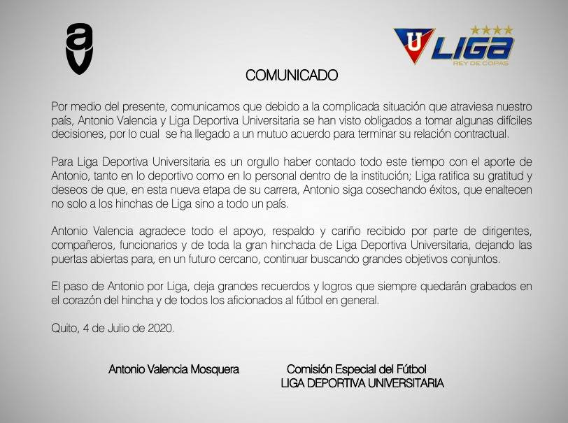 Il comunicato del club ecuadoriano: “Per mezzo del presente, comunichiamo che vista la complicata situazione in cui riversa il Paese, Antonio Valencia e la LDU si sono visti obbligati a prendere alcune difficili decisioni e hanno deciso di terminare la loro relazione contrattuale. Per la LDU è un orgoglio aver contato per tutto questo tempo sull'apporto personale e sportivo di Antonio”.