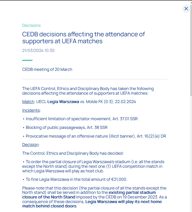 La Commissione Disciplinare, Etica e di Controllo della UEFA ha inflitto sanzioni al Legia Varsavia per uno striscione con un messaggio offensivo e per i tifosi che hanno bloccato il traffico durante la sfida casalinga di Conference League contro i norvegesi del Molde del 22 febbraio scorso, persa 0-3.