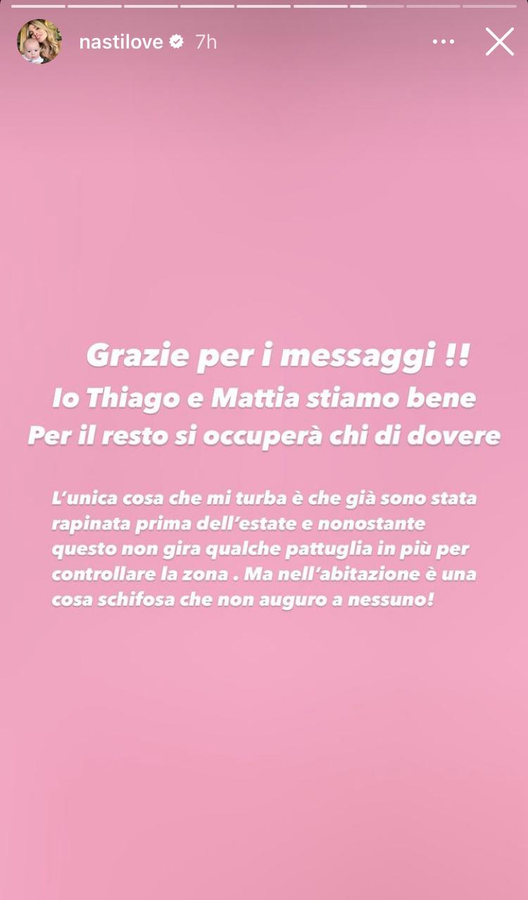 La 26enne, sempre attivissima sui social, si è sfogata con i suoi follower, ringraziando chi si è preoccupato per loro, in modo particolare per il loro bambino Thiago, che ha compiuto da poco un anno. Nascondere la rabbia non è stato semplice, soprattutto perché non si tratta del primo furto commesso ai loro danni. "Grazie per i messaggi – ha scritto sul proprio profilo Instagram - Io, Thiago e Mattia stiamo bene, per il resto si occuperà chi di dovere. L'unica cosa che mi turba è che sono stata già rapinata prima dell'estate e nonostante questo non gira qualche pattuglia in più per controllare la zona. Ma nell'abitazione è una cosa schifosa che non auguro a nessuno".