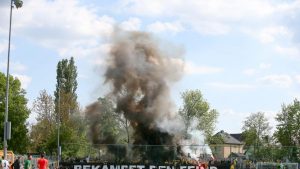 I teppisti in quella occasione hanno lanciato di tutto contro gli agenti di polizia: doghe, travi, assi, sedie, tavoli interi. Anche il BSG Chemie deve pagare 7.000 euro. Dura per i Leutzscher la sanzione di un derby a porte chiuse, sospeso fino al 30 giugno 2023 in libertà vigilata. Dalla curva Lokomotiv erano partiti razzi e fumogeni che avevano portato alla sospensione temporanea della gara.
