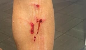 Nella foto grande le condizioni della gamba sinistra di Takumi Minamino, nazionale giapponese del Monaco, dopo il duro intervento dell'espulso Dante durante Nizza-Monaco...