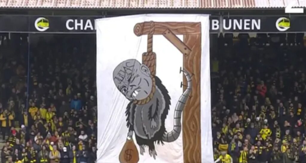 Lo striscione incriminato è stato affisso sopra il tunnel degli spogliatoi. Mostrava un uomo disegnato come un topo appeso a un cappio con un sacco di soldi in mano. Inoltre, i tifosi del Lillestrøm hanno cantato: " Dopo la partita morirai".