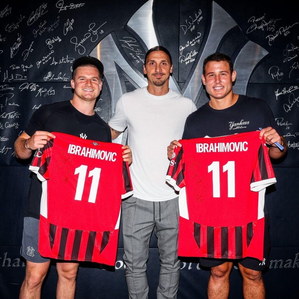 Ibra si è presentato in campo molto ben preparato. Maglie rossonere alla mano e con un abbigliamento ad hoc: maglia degli Yankees, sneakers bianche e pantalone grigio.