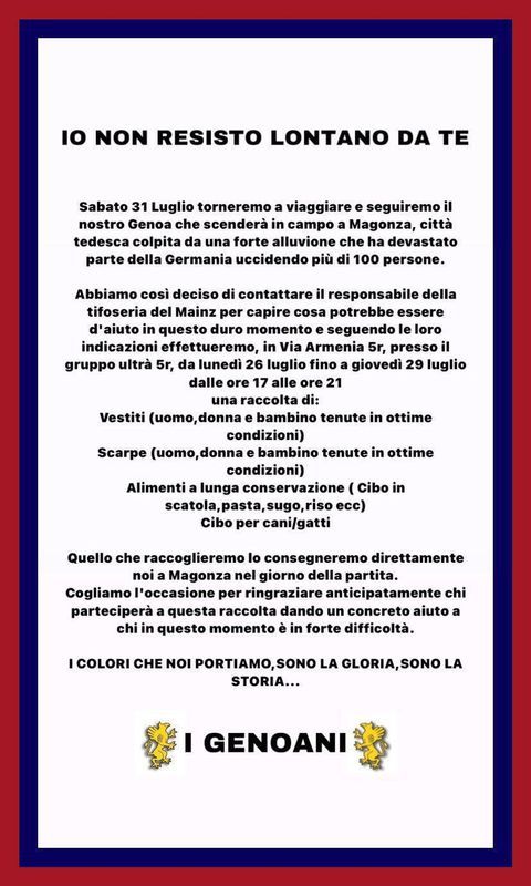 “Abbiamo deciso di contattare il responsabile della tifoseria del Mainz per capire cosa possa essere d’aiuto in questo momento” si legge nel messaggio. La raccolta, in Via Armenia 5r, comincerà il 26 e terminerà il 29 luglio.