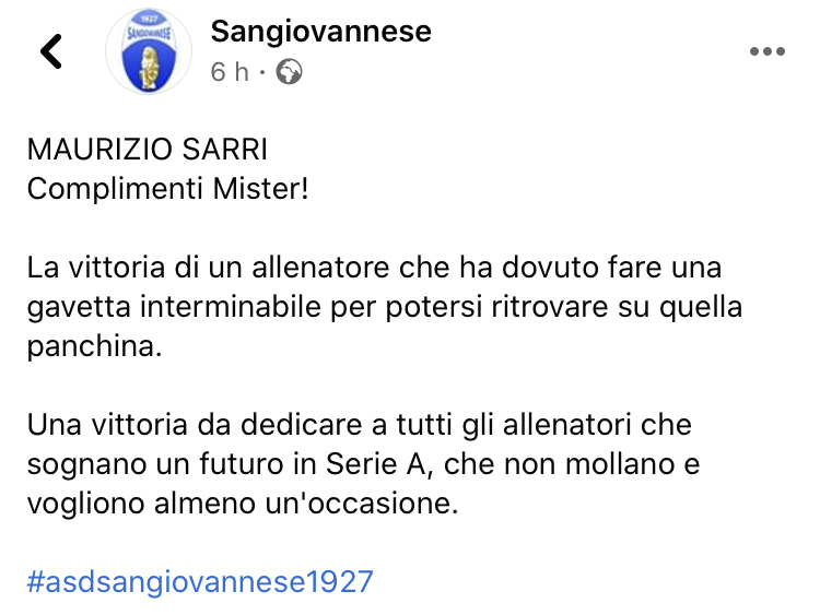Il primo aretino a vincere il campionato di Serie A, inoltre, ha ricevuto gli auguri social anche della Sangiovannese, da lui portata in C1: “Complimenti mister! La vittoria di un allenatore che ha dovuto fare una gavetta interminabile per potersi ritrovare su quella panchina. Una vittoria da dedicare a tutti gli allenatori che sognano un futuro in Serie A, che non mollano e vogliono almeno un’occasione”.