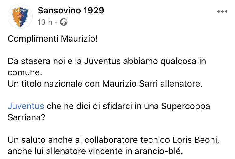 “Complimenti Maurizio! Da stasera (ieri, ndr) noi e la Juventus abbiamo qualcosa in comune. Un titolo nazionale con Maurizio Sarri allenatore. Juventus che ne dici di sfidarci in una Supercoppa Sarriana? Un saluto anche al collaboratore tecnico Loris Beoni, anche lui allenatore vincente in arancio-blé”.