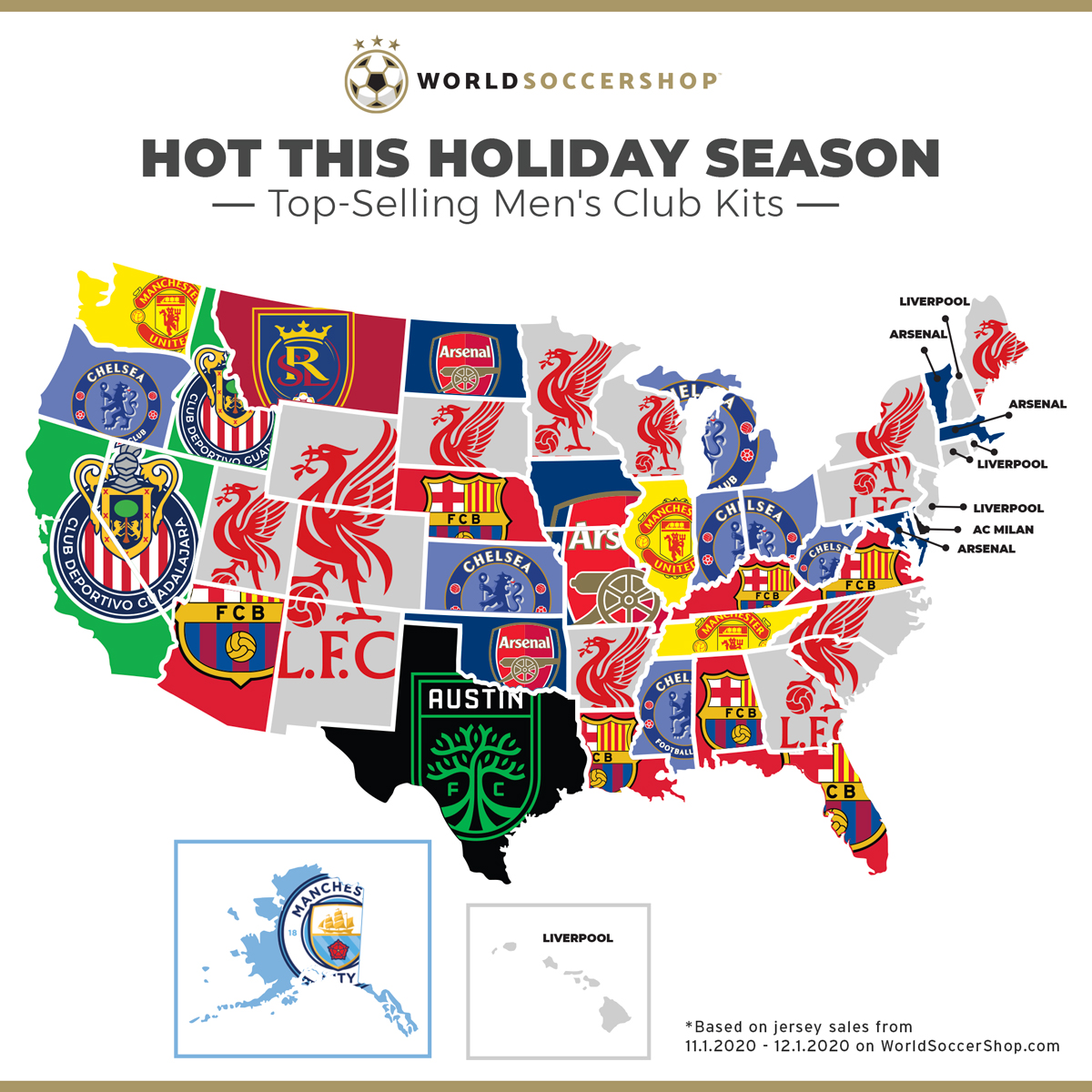 Le informazioni indicano come il Liverpool sia in testa alle vendite in 18 stati USA: Maine, New Hampshire, Rhode Island, Connecticut, New Jersey, New York, Pennsylvania, Georgia, Carolina del Sud, Carolina del Nord, Arkansas, Minnesota, Wisconsin, South Dakota, Wyoming, Utah, Colorado e New Mexico. Dietro il team allenato da mister Jürgen Klopp, Arsenal, Chelsea e Barcellona, “regine” in sette stati; poi il Manchester United “re” in tre, mentre Milan (unico club italiano presente nella mappa) e Manchester City “conquistano” uno stato a testa.