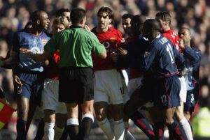 Poi la battaglia di Old Trafford, la sfida del 21 settembre del 2003. Al termine di quella stagione, l'Arsenal vincerà la Premier League senza perdere nemmeno una sfida, ma ci andò davvero vicino in quella occasione quando, ad un quarto d'ora dal novantesimo, Ruud Van Nistelrooy, in maniera non proprio corretta, causa l'espulsione di Patrick Vieira, metronomo del centrocampo di Wenger. Un episodio che scatena la furia dei Gunners che partono in una vera e propria caccia all'uomo che porta anche ad un calcio di rigore per il Manchester United. Dal dischetto, proprio l'attaccante olandese centra la traversa e la gara terminerà per 0-0, ma segna un solco indelebile nella storia della rivalità fra i due club. Protagonista assoluto, oltre a Vieira e Van Nistelrooy, il capitano dello United, Roy Keane, strenuo difensore del compagno di squadra nonostante le scorribande degli avversari.