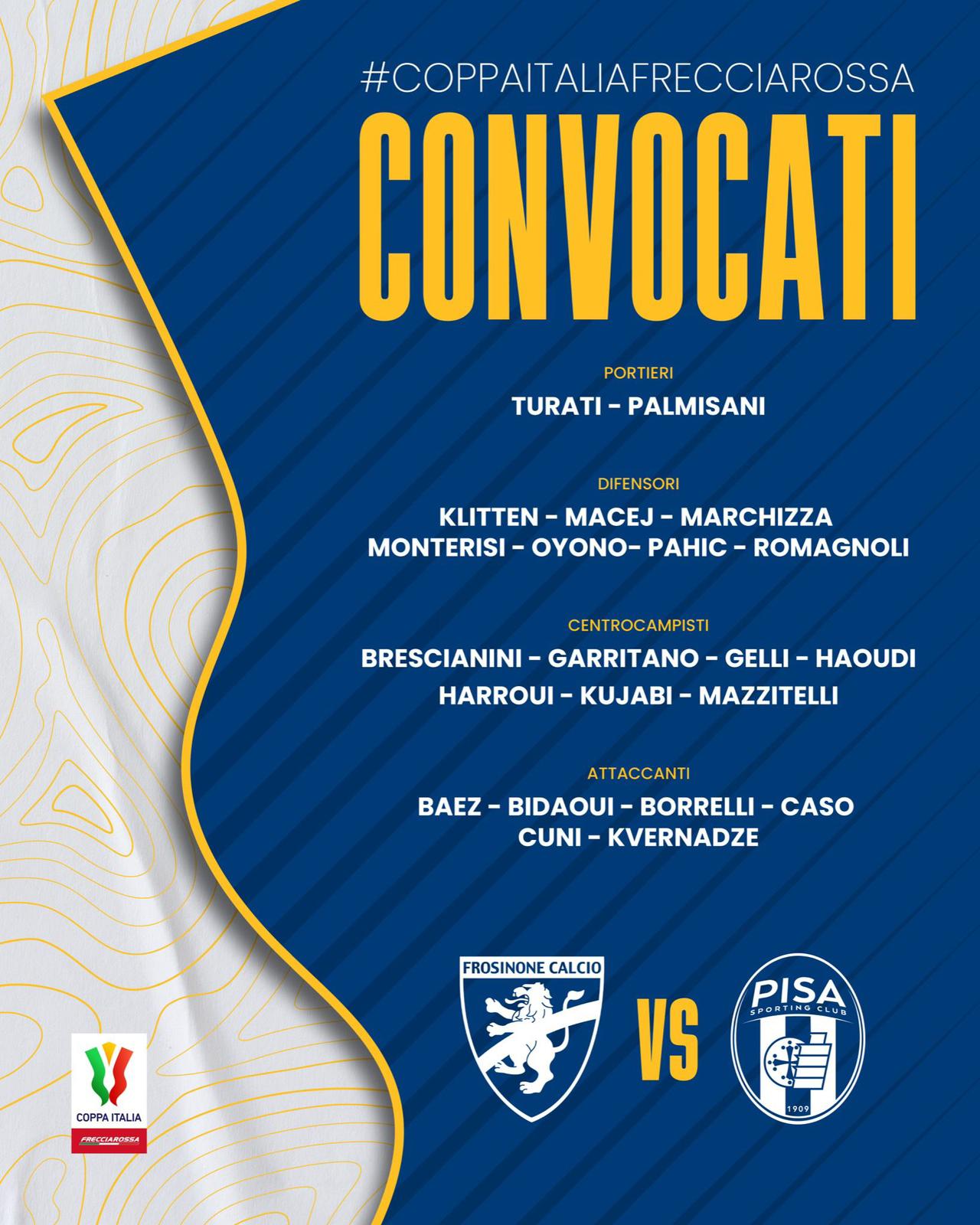 Al Benito Stirpe, nel match valido per i trentaduesimi di finale della Coppa Italia Frecciarossa, arriva il nuovo Pisa di Alberto Aquilani. Calcio d'inizio alle ore 17.45 con diretta tv su Canale 20 e in streaming su Mediaset Infinity. Chi vince affronterà nel turno successivo la vincente di Torino-Feralpisalò. Chi passa, poi, sfiderà il Napoli agli ottavi.
