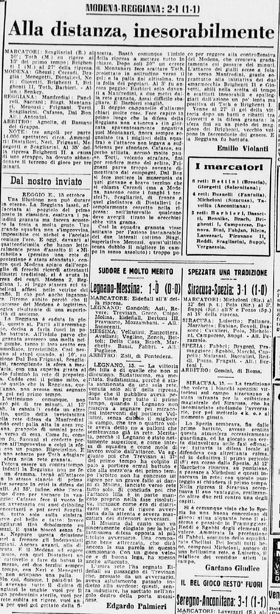 Tabellino Reggiana-Modena 15 ottobre 1950