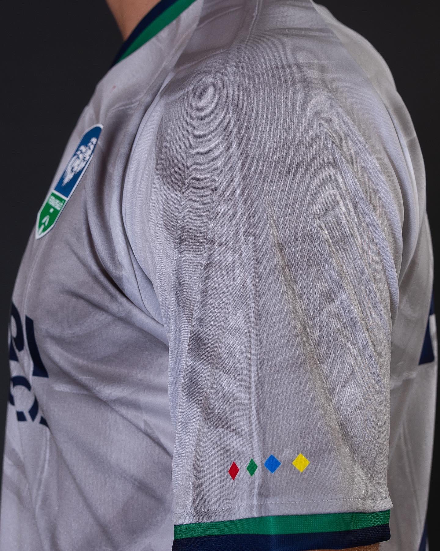 Lo scollo a V è studiato per resistere agli strappi durante i traumi di gioco e, così come i polsini, è realizzato in maglina tecnica, elastica e a rapida evaporazione del sudore.