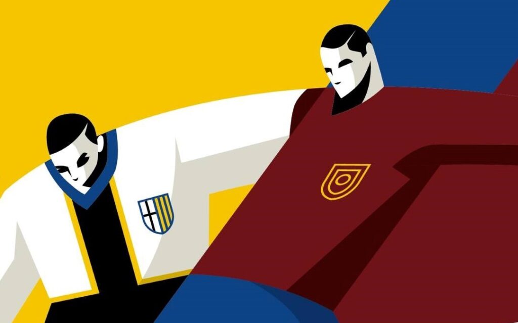 Due calciatori si contendono il pallone e la vittoria, sulla striscia blu che rappresenta il torrente Enza, confine tra le provincie di Reggio Emilia e Parma. Blu che è anche l’unico colore in comune tra i due club.